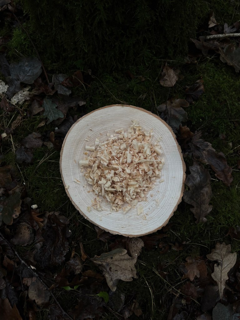 The plates are filled with wood shavings that still contain mycorrhizal species that will help the trees grow, plugging new growth into the mycelial networks of the forest.