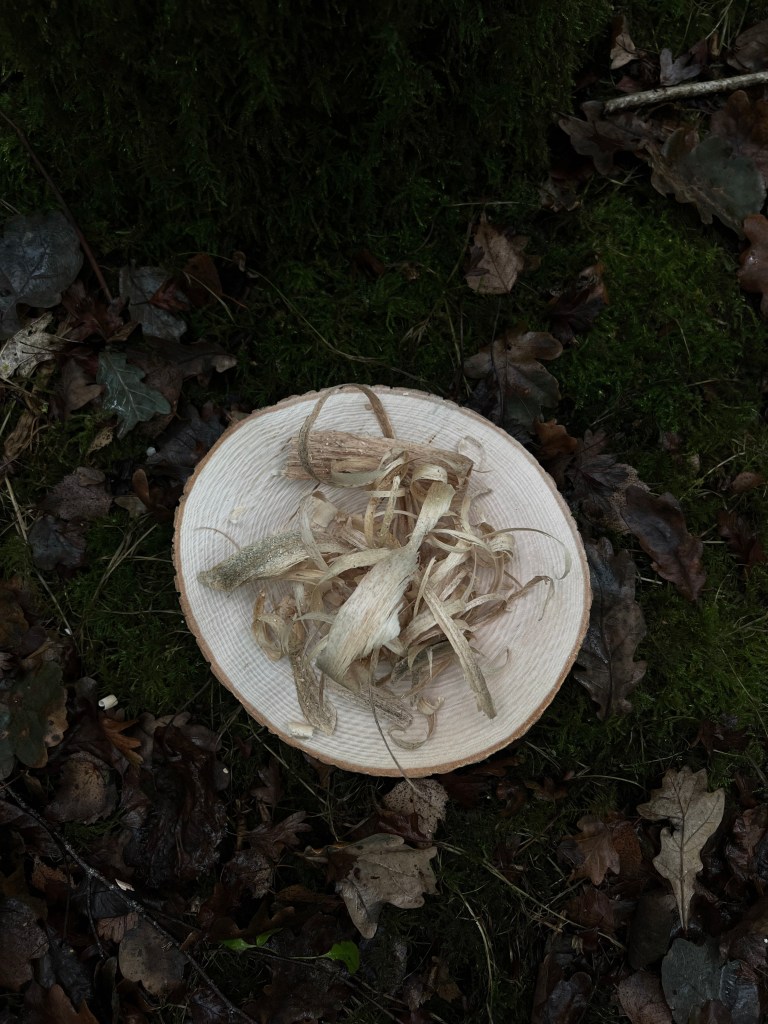 In my own ritual of exchange with the ash tree I bring the plates into the forest and find an ash tree. Where the plates were unstable on the workshop table, they fit naturally between the sticking-out roots and the wet soil.